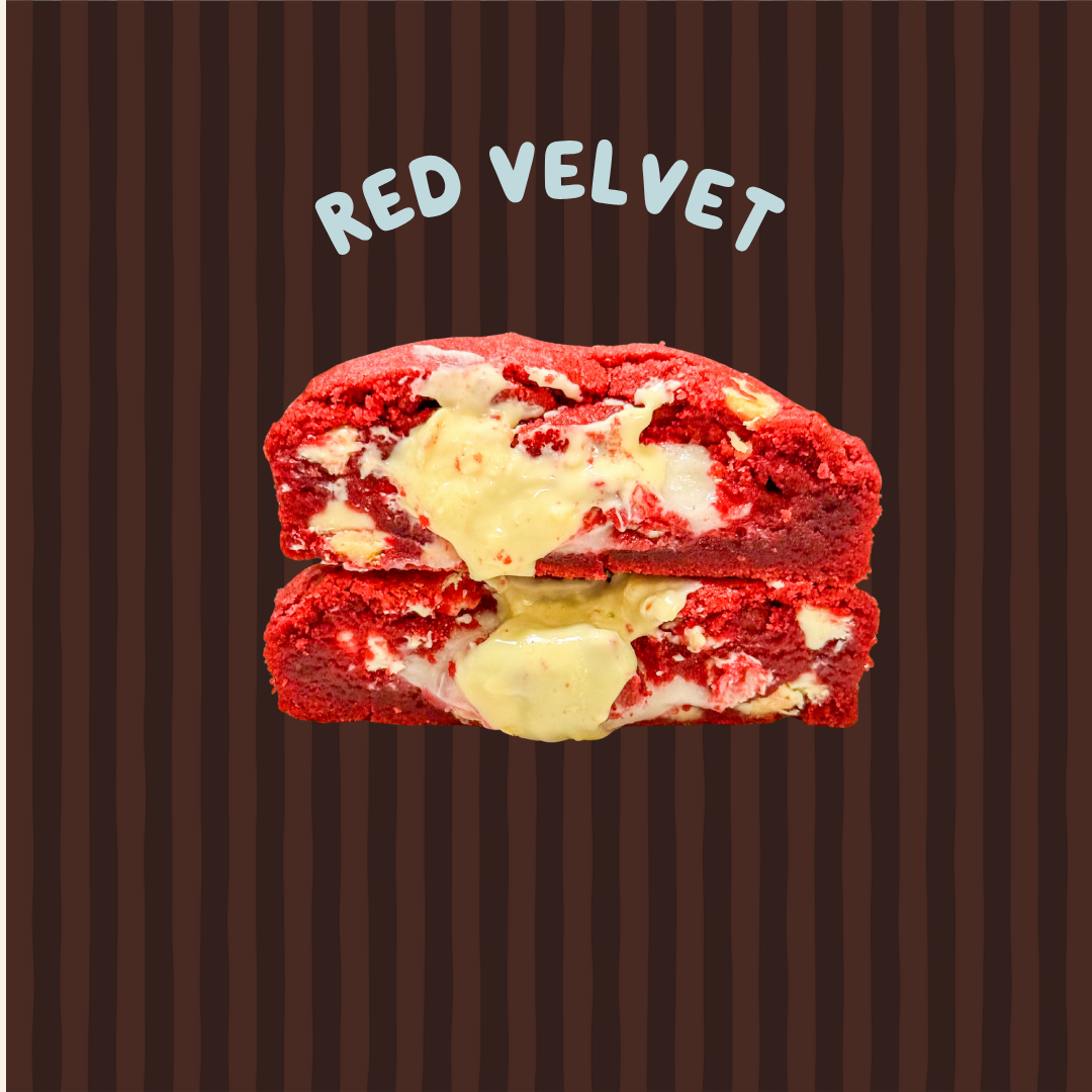 Our Red Velvet is made with a vanilla dough with a small amount of cocoa, white chocolate chips and a cream cheesecake filling.