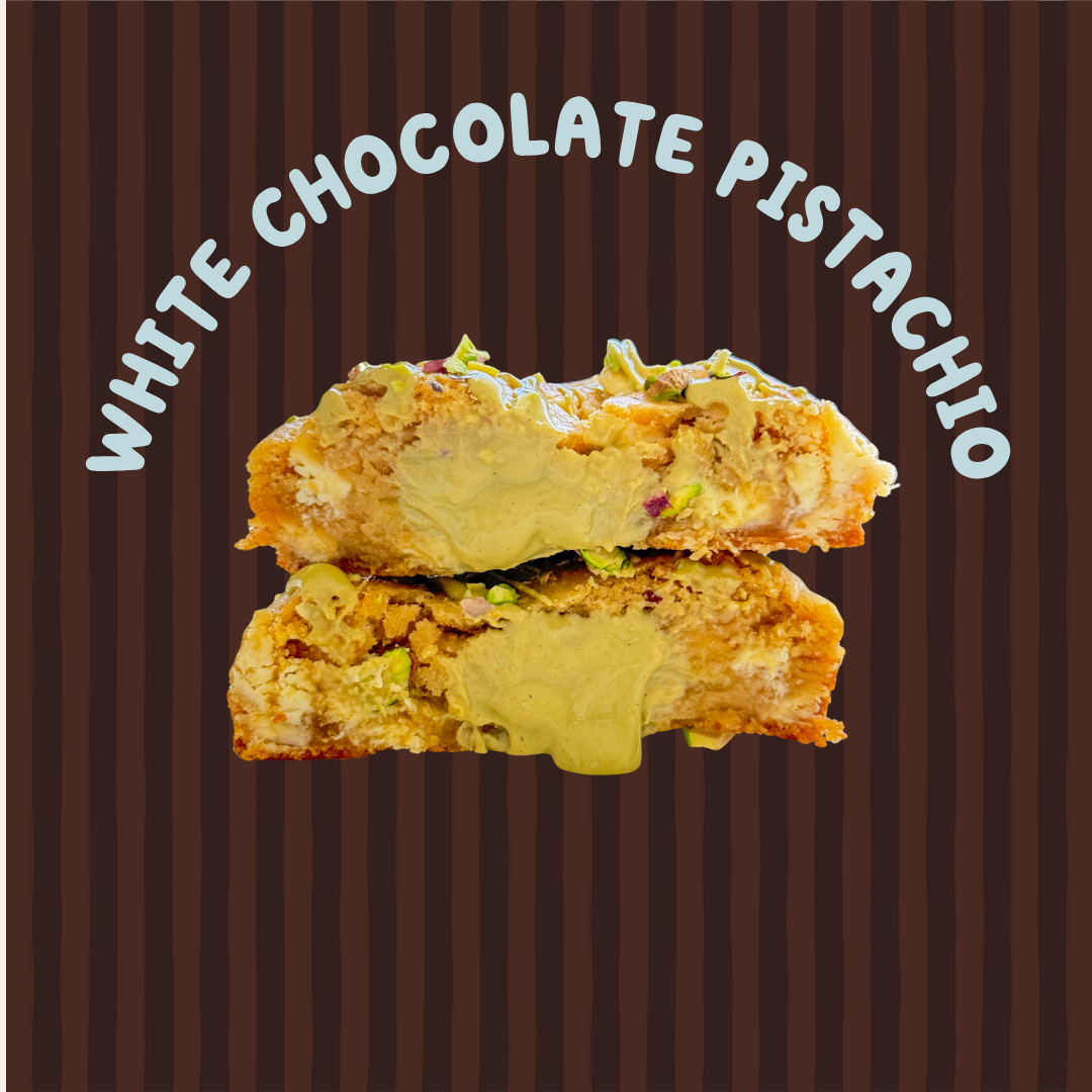 Our white chocolate pistachio is made with our vanilla cookie dough, Cadbury white chocolate chips, pistachio papi, Cadbury white chocolate and pistachios.