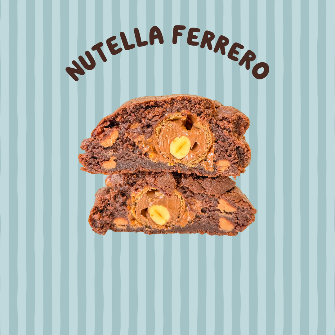 Our Nutella Ferrero is made with our Chocolate Cookie Dough, Nutella, Chocolate Chips and Ferrero Rocher.
