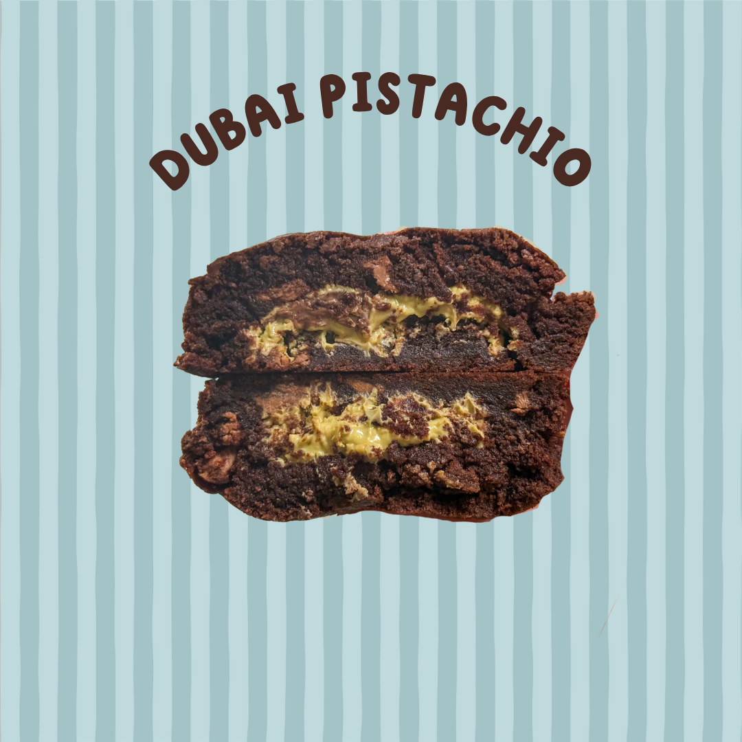 Our Dubai Pistachio is made with our chocolate cookie dough, Cadbury chocolate chips, katafi, pistachio papi and pistachios.
