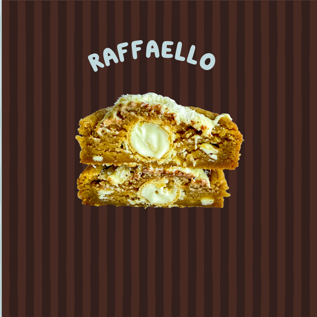 Our Raffaello is made with our vanilla cookie dough, white chocolate chips, coconut and a Raffaello.