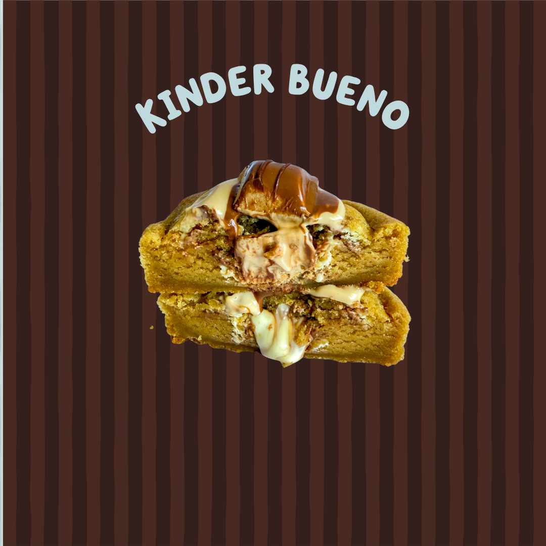 Our Kinder Bueno is made with our vanilla cookie dough, Cadbury white chocolate chips, Cadbury milk chocolate chips, kinder bars, white chocolate hazelnut spread and kinder bueno.