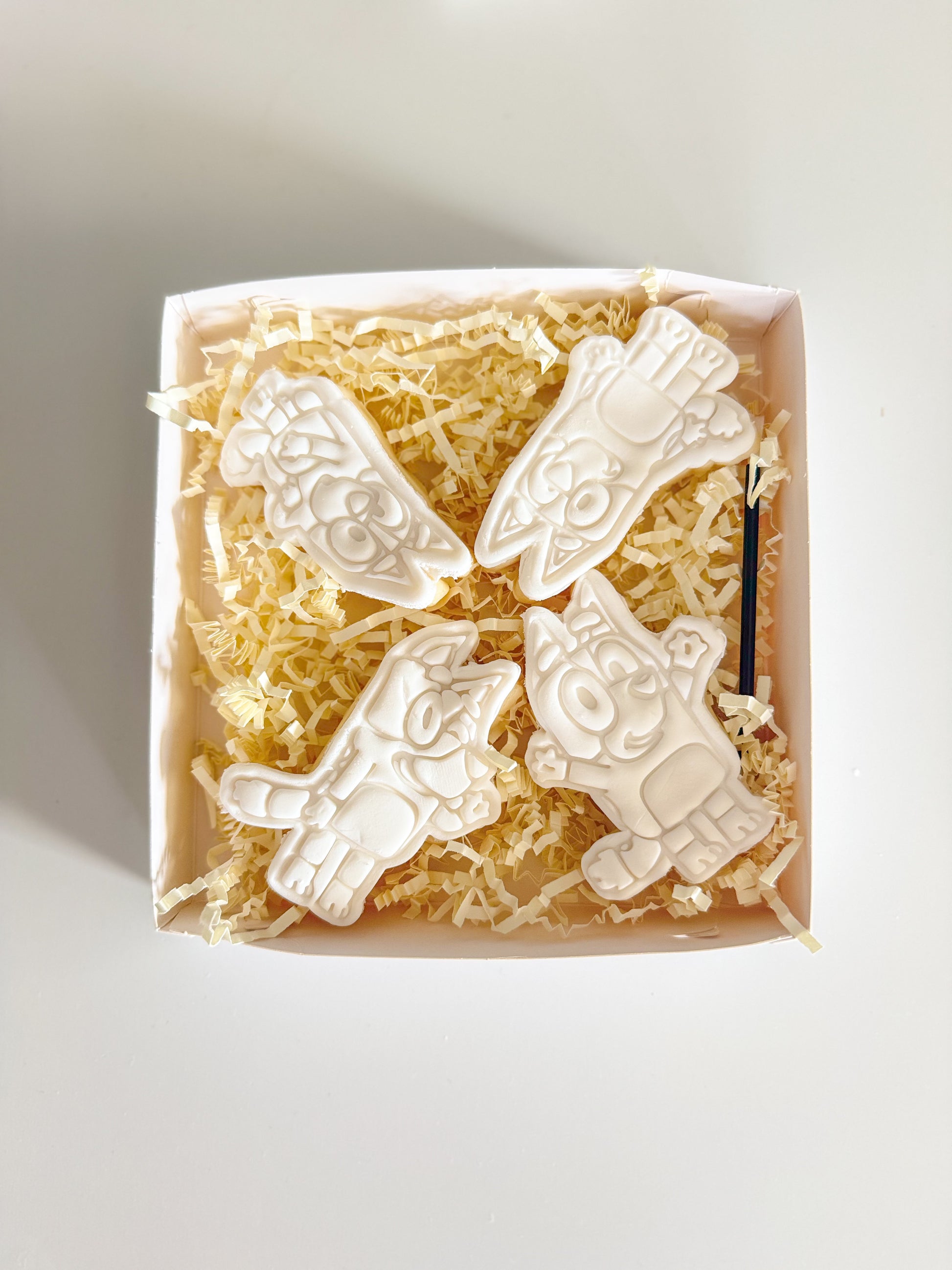 Our Bluey PYO pack includes 2 Bluey and 2 Bingo character PYO Sugar Cookies it comes with a paint brush and 1 edible colour palette.