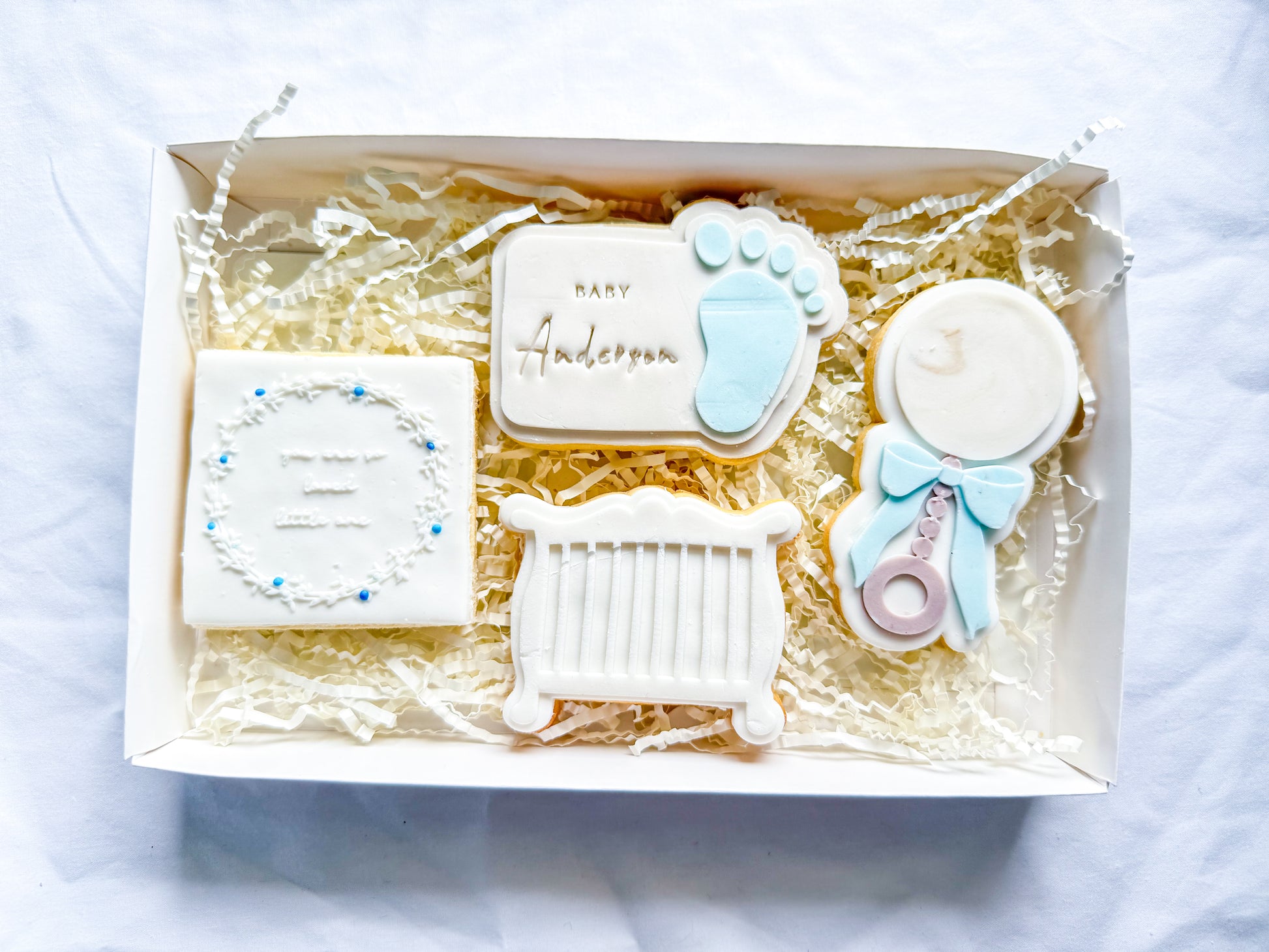 They can come in Beige and White, Blush and White or a Blue and White theme. They come with a range of our baby designs and a custom Baby______ Cookie.